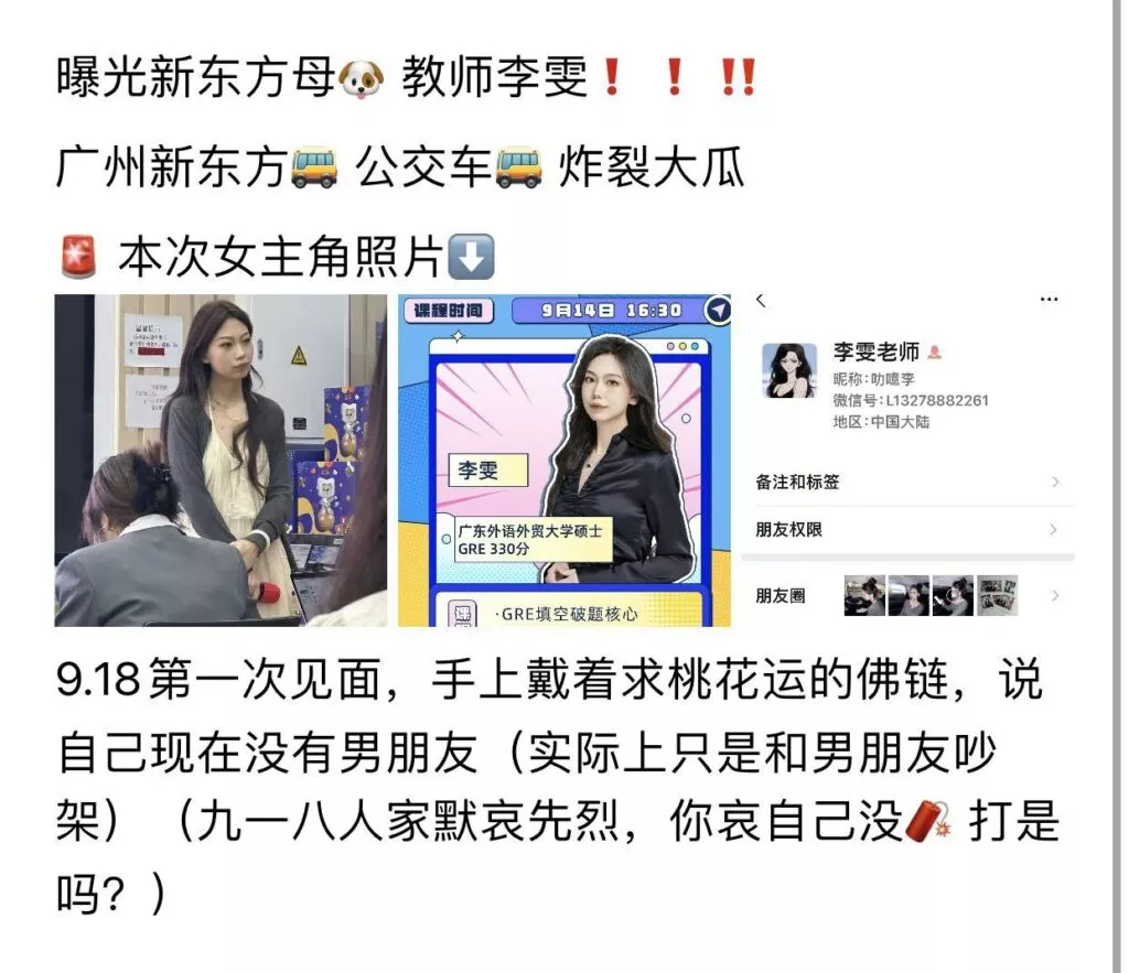 广州新东方公交车教师李雯男女通吃出轨劈腿男友私会学生约炮被曝记录
