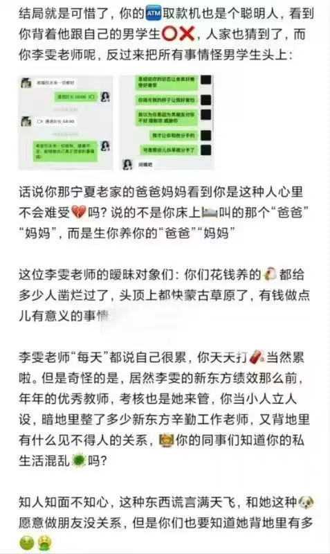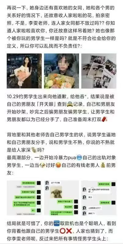 广州新东方培训机构的一名教师李雯,担任英语口语教学工作。她凭借出众的外貌获得了不少关注。然而,表面上看似认真负责的她,实际上却心存私欲,为了达到自己的目的不惜采取各种手段。她在与男友交往期间背着他四处约会,甚至还对女同事进行欺骗。为了获得休假,她虚构了自己被学生威胁的谎言,利用这一借口劝退学生,自己则选择在家休息。种种不当行为的聊天记录也因此被曝光,令人震惊。