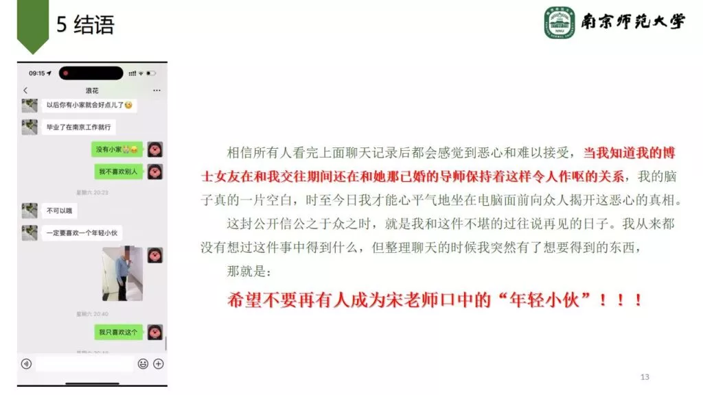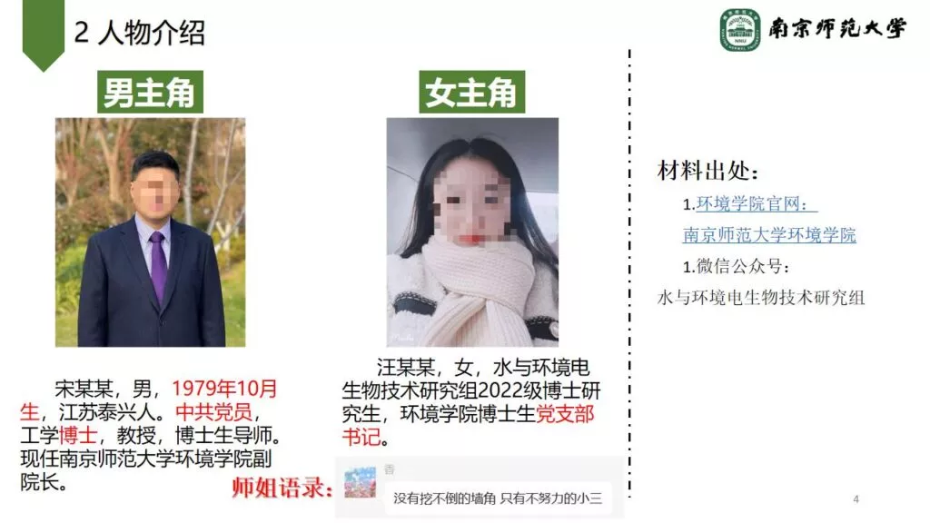 南京师范大学师德败坏事件,南京师大一男子曝料自己的博士生女友,长期与其导师宋某某保持不正当关系,其女友觉醒本质,成为学术妲己,高度绑定自己与导师的地下恋情相互利用,身体与学术地位在这一刻水孚交融,男子的师姐表示:没有挖不倒的墙角,只有不努力的小三。