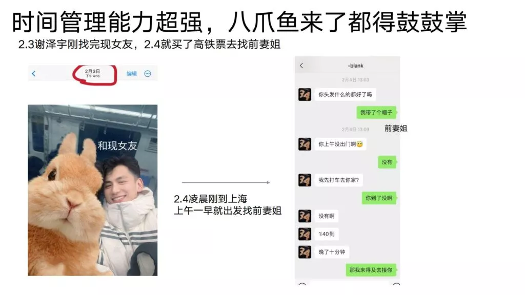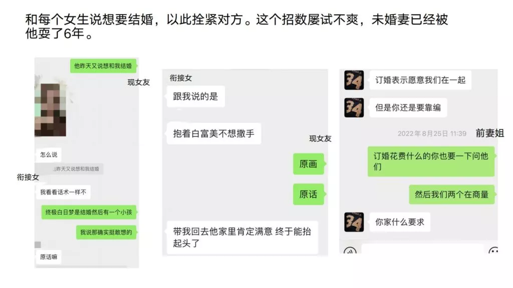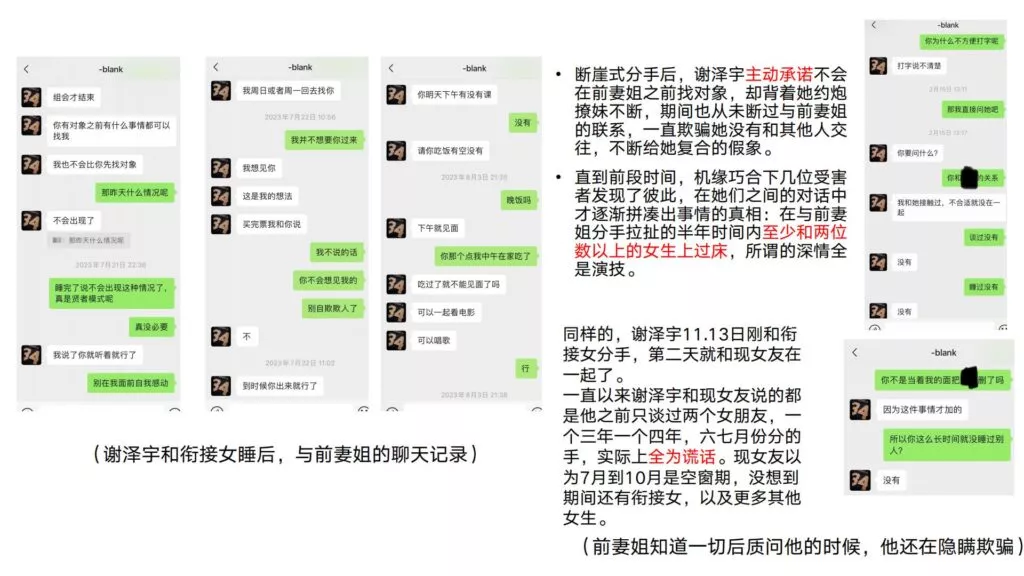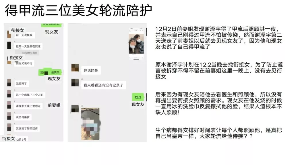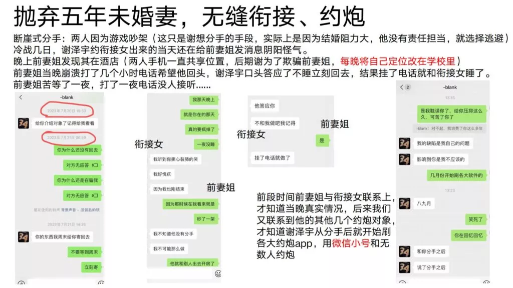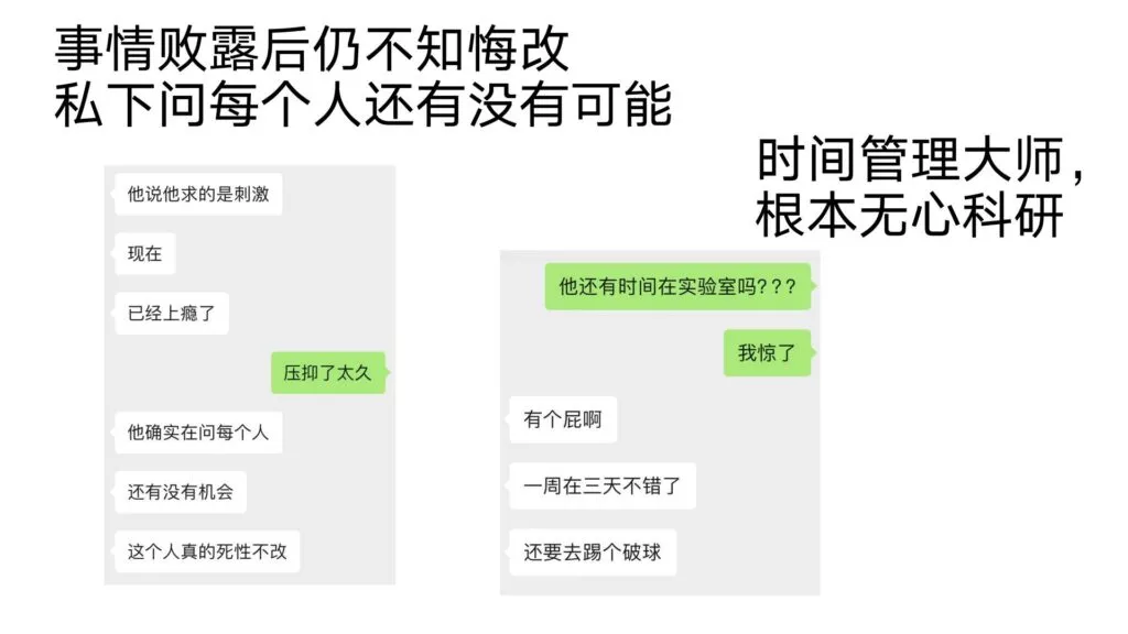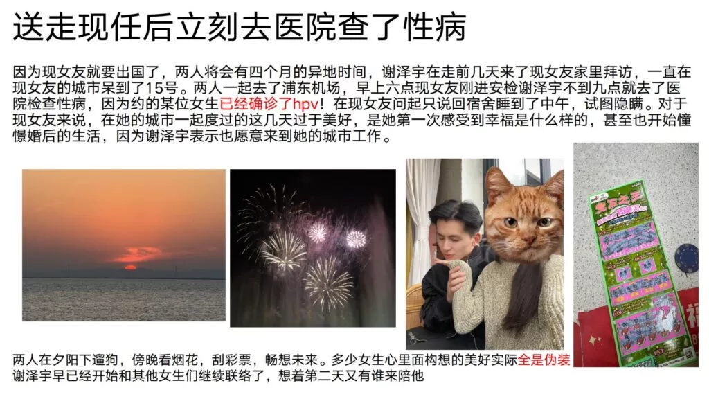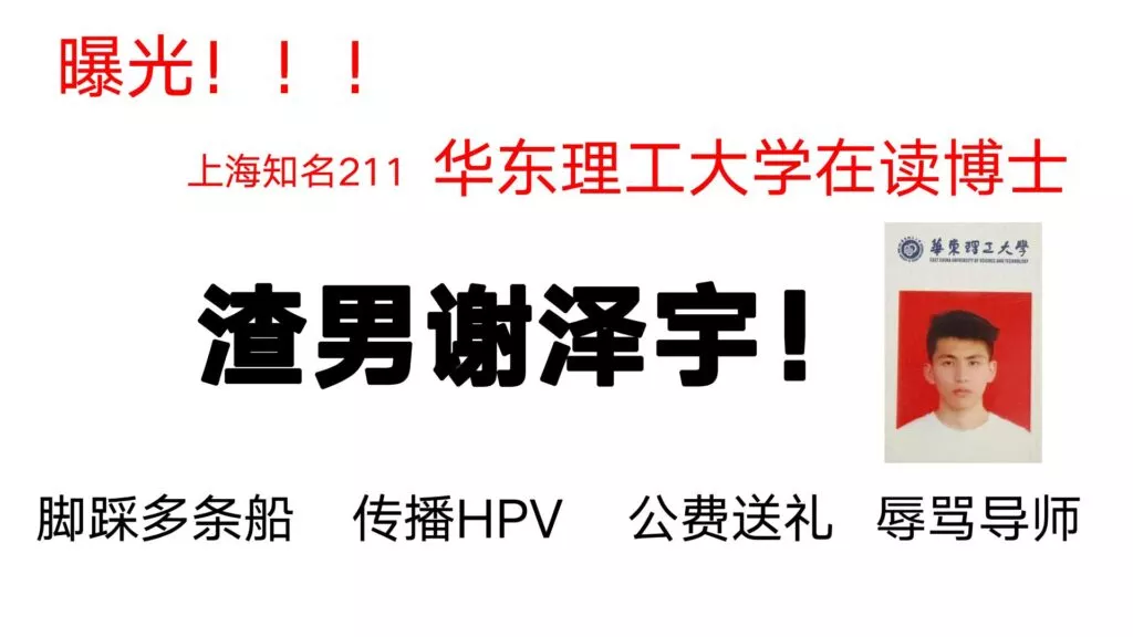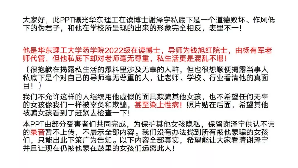 24页的PPT曝光了华东理工大学毒王谢泽宇,此人是上海211名校的学生。他的未婚妻,交往了五年,揭露了他的不堪行径:他长期与多名女性保持暧昧关系,身患性病却毫无自爱之心,利用PUA手段Cao控多位女性,从而导致她们也受到感染。同时,他还利用研究经费来贿赂他人,为自己的私利谋取便利,甚至公开辱骂自己的导师。