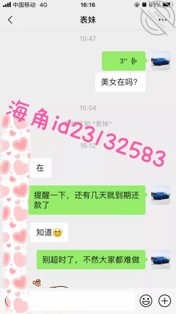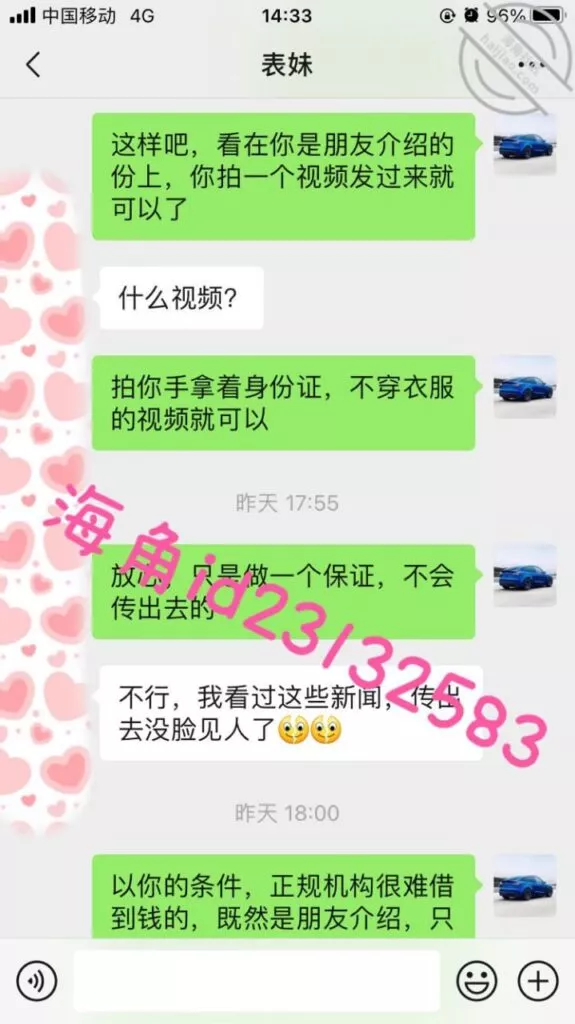 微信小号加了表妹之后她说想借1万,我问她有没有房子车子和工作社保,这属于明知故问让她跟着我的节奏走,然后引导她拍果贷视频给我,之后她就没有回复我了,希望她找不到其他人借钱吧
