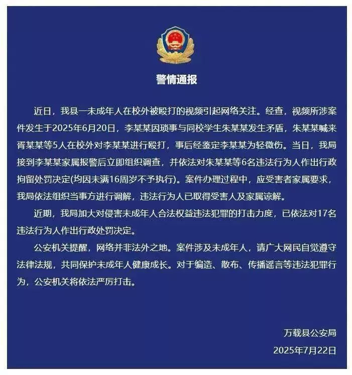 2025年6月20日,在万载县的一个公共场所,发生了一起暴力事件。7月19日,事件视频被公开。视频中显示,15岁男生李某某因琐事与同校学生朱某某发生争执,随后朱某某纠集了胥某某等5人对李某某进行了围殴,持续时间约为5分钟。