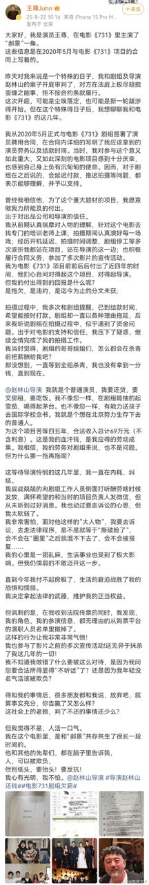内地电影《731》演员王尊,突然发文指责《731》剧组多次欠薪,其本人声称,在电影拍摄阶段,剧组曾多次遇到停工以及资金问题,是他始终支持导演赵林山完成这部电影,没想到换来的却是被除名以及高达70万元的薪资欠款。