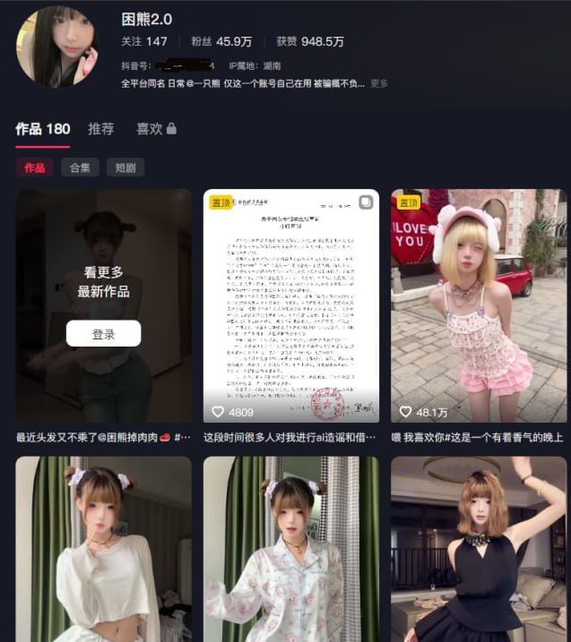 抖音46万粉丝纯欲风网红困熊2.0,萌系嫩妹擦边那是相当具有杀伤力,这么可爱的萌妹却被传出拍摄大尺度视频,实际确实ai视频惹的祸。