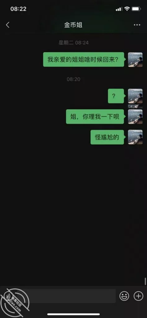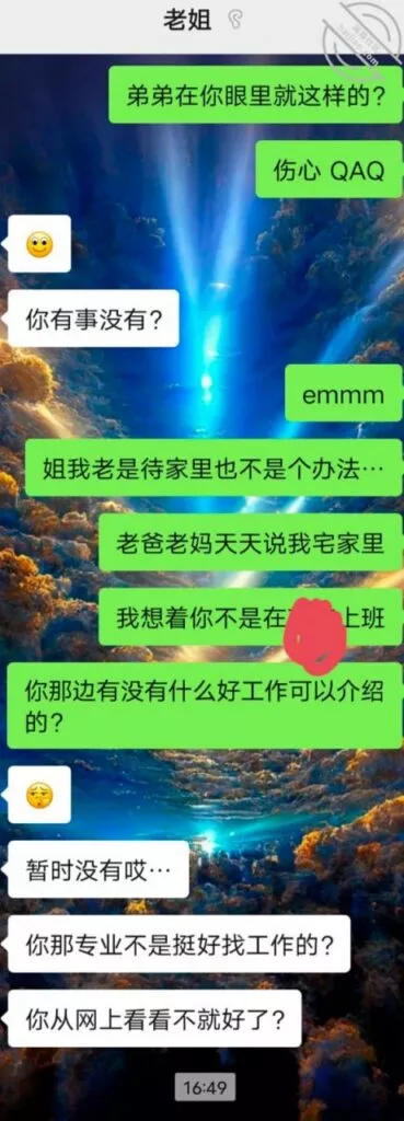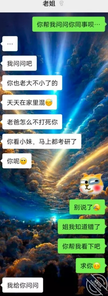 没想到哇,我去公司里加班的时候,我姐给我发消息了。。