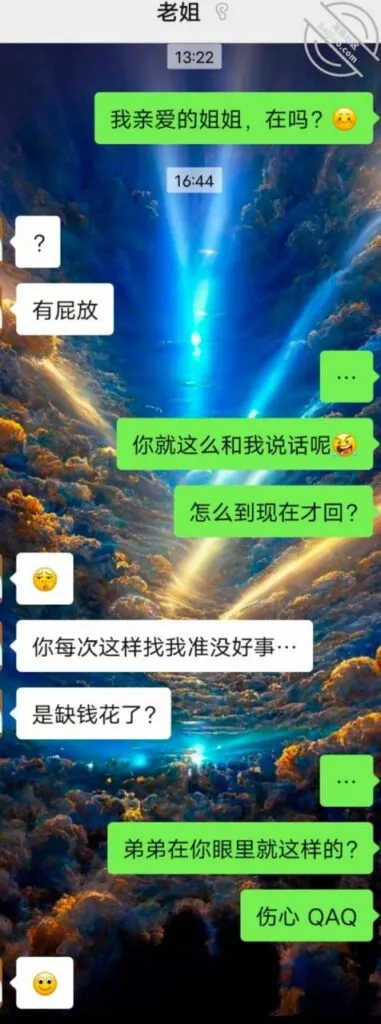 海友们,我先写好遗书。刚刚我姐又打电话叫我了,语气很不友好。感觉像是火山快爆发了。如果后面断更了….别想我我现在网吧包厢给你们剪辑,发帖子。我有点不敢回去。我姐从今天上午酒醒了,我叫她起床吃饭以后一直在盯着我看。被看得有点发毛,我就说出来转转。这是我来我姐上班城市的第六天了。我之前还在纳闷,我姐在公司干的好好地。怎么突然换工作了。毕竟待遇还是比较不错的。原来是因为我姐前男友的原因,之前姐姐发现男朋友出轨分手后,就一直没谈恋爱。但是那男的也一直没放弃我姐。基本上每周都会来我姐家门口求原谅。最终我姐心软,原谅了他在23年年初的的时候又和那男的复合了。我说当初我去我姐那边工作的时候,我姐死活不愿意让我去她那边住。宁愿给我也不愿意让我过去住。原来是和别的男人同居了!我姐叫我过来的原因是,那男的又出轨就在24年年初又被我姐发现了!我都气笑了。
